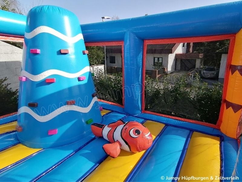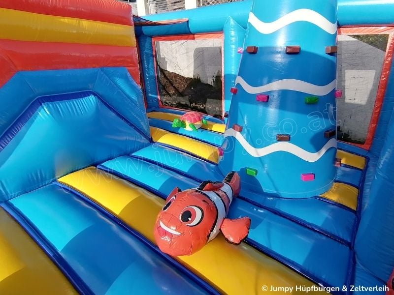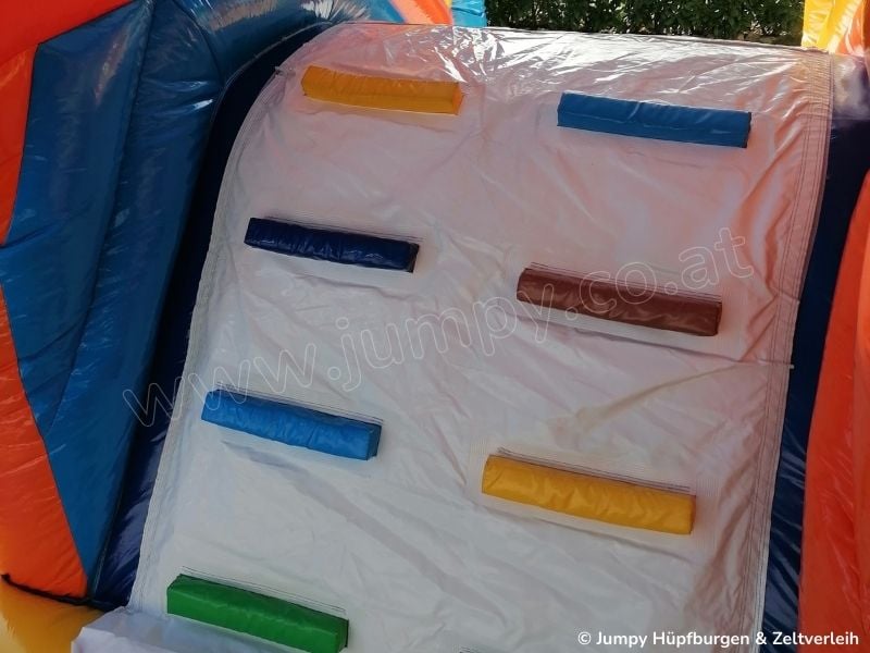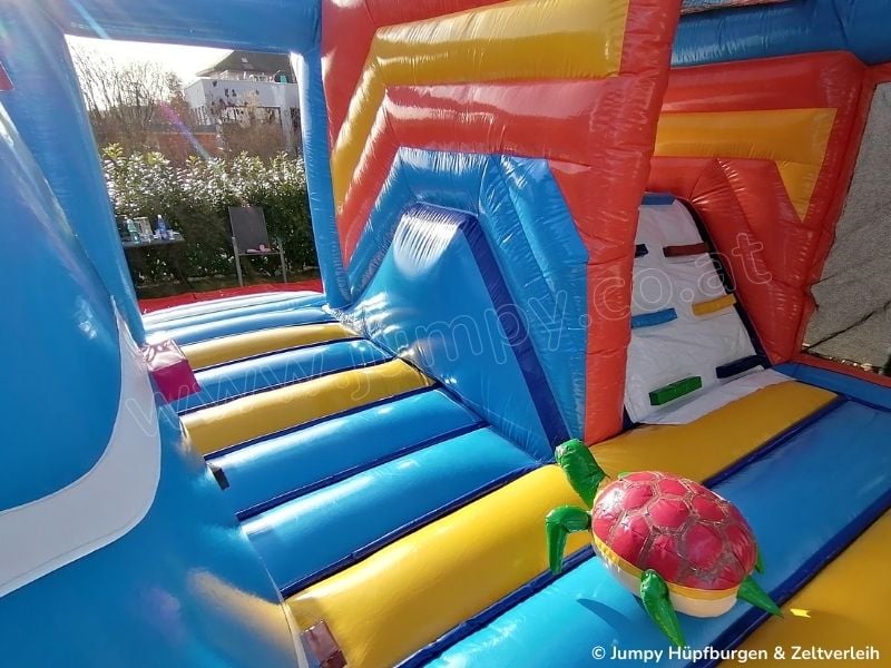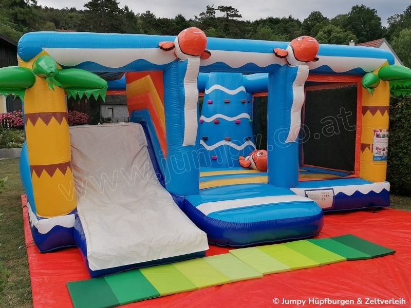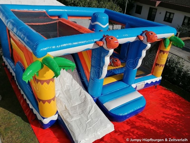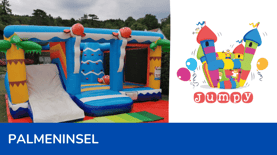 Unsere Hüpfburg „PALMENINSEL" ist mit einer großen Hüpffläche, einem Kletterturm, einer Doppelrutsche und lustigen Tieren auf denen man reiten kann ausgestattet. Die seitlichen Netze verschließen den Hüpfburg -Innenraum komplett und machen sie damit besonders sicher. Zusätzlich ist sie das absolute Highlight auf jeder Veranstaltung und Feier wo viele Kinder anwesend sind.