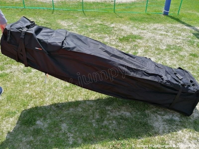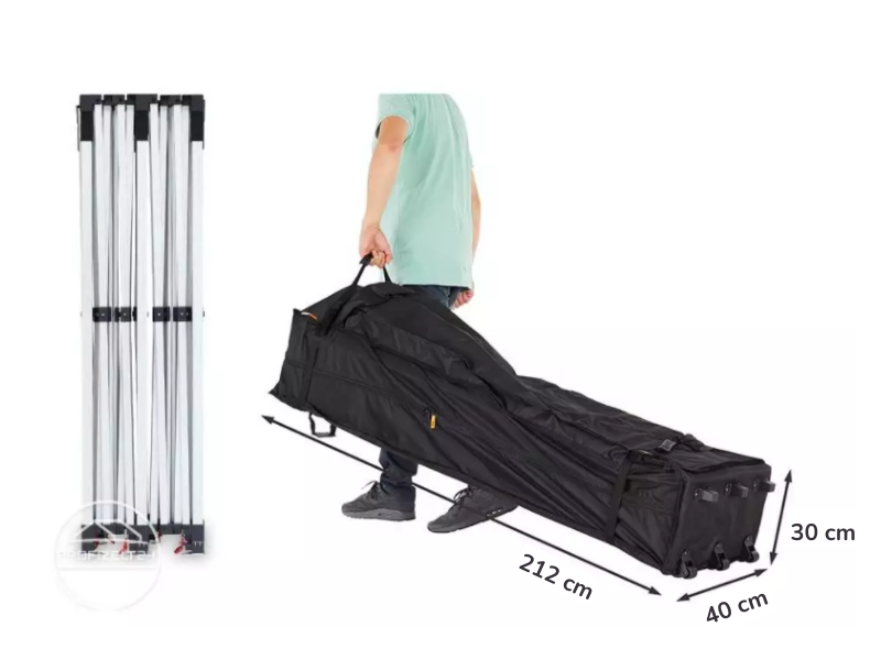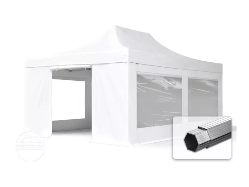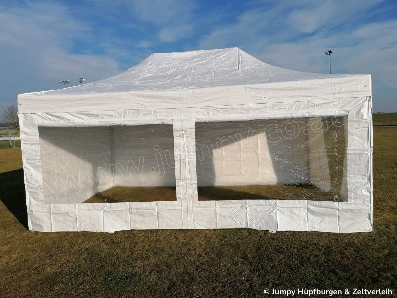 Professioneller Faltpavillon inklusive 4 Seitenteile mit 2 Türen und 4 Panoramafenstern, die mit Rollo verdunkelt werden können.